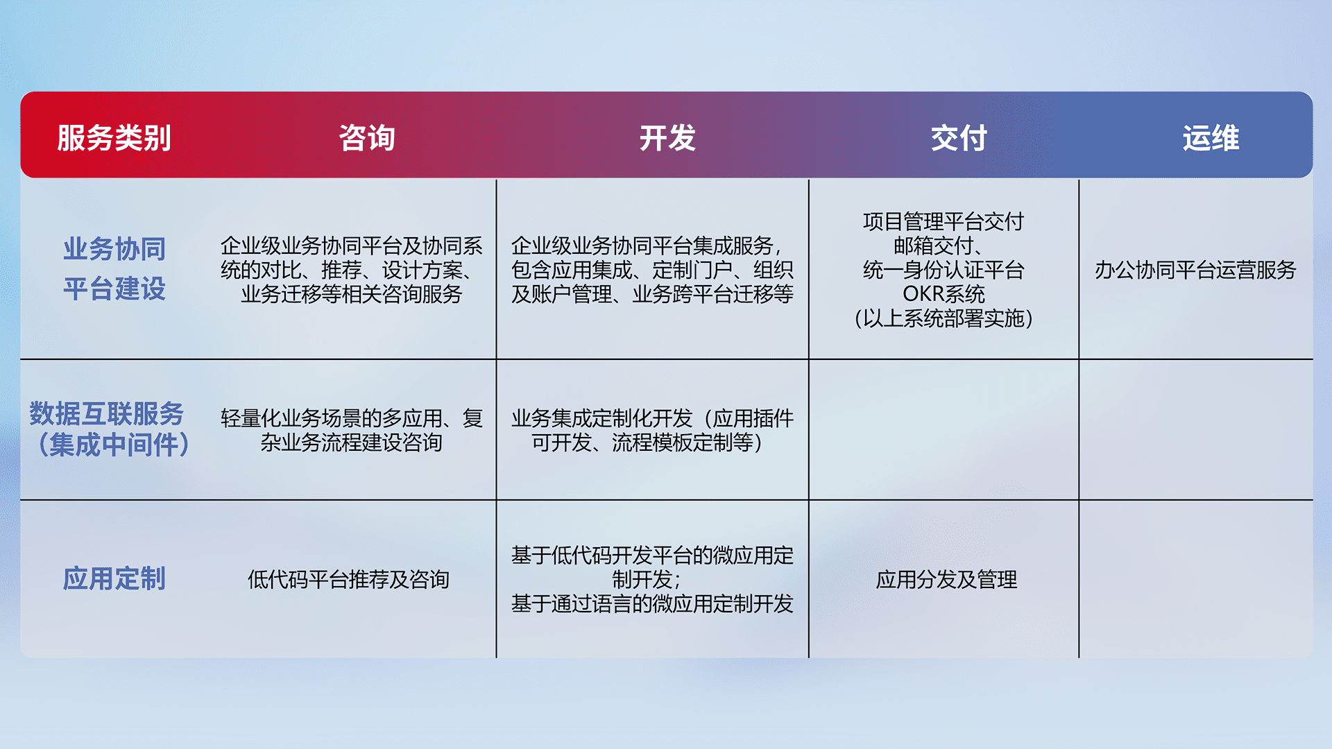 针对钉钉、、、、企微、、、、IDaas等平台级产品提供产品的规划、、方案、、交付、、定制化开发等服务,,实现如统一协同办公、、、、智能客户服务、、、、混合会议管理、、智能数据查询、、等业务场景,,,,实现数字化转型。。。
